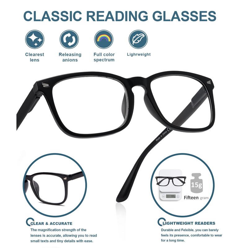 - Lectores con marco TR90 ligero y lentes de plástico, ligero y cómodo.