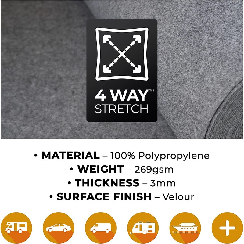 - Highly flexible 4-way stretch roof and wall lining carpet can be used in vans, minibuses, motorhomes, campervans, boats and more.