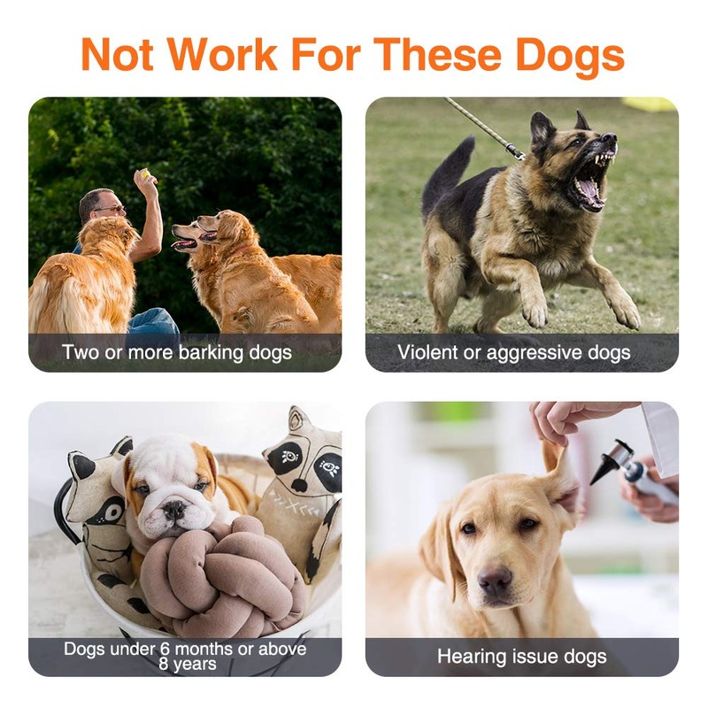 - 🐾【Fits for Most Dogs】 The device works on most breeds and sizes, but does not work on deaf or hearing impaired dogs. Some dogs may be afraid or dislike the ultrasonic sound, and not stop barking at the beginning. Please allow up to 2 weeks for training.