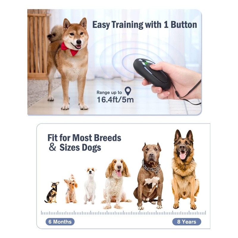 • 🐕‍🦺【1 Button to Stop Dog Barking】: This Anti Dog Barking Device is easy to use, you just need to press & hold the button, it will emit ultrasonic to attract the dog's attention and stop your dog or neighbor's dog from endless barking, digging, fighting and chewing. Repeated training and appropriate rewards are necessary to achieve the desired result.
