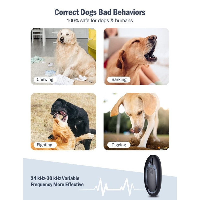 • 🐕‍🦺【Safe & Harmless Bark Stopper】: The Dog Training Device uses 24KHz-30KHz ultrasound technology, no electric shock, no liquid or spray, which has no effects on the health of pets & humans. It is silent for humans (humans only can hear 20Hz~20KHz sounds), but dogs can hear 15Hz~50KHz sounds, dogs hate this sound and will stop their bad behaviors.