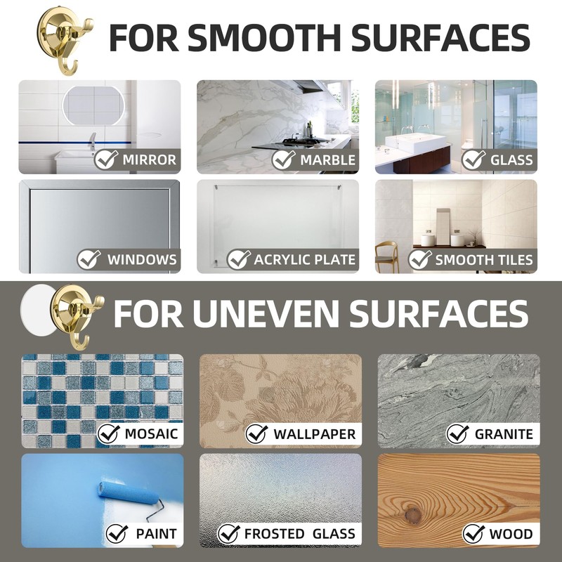 These two flexible installation methods make the hooks widely applicable to various common surfaces, such as windows, mirrors, glass, ceramics, wood, wallpaper, marble, porcelain, acrylic and more, to meet your organization needs in different spaces (such as bathrooms, bathtubs, kitchens, refrigerators, sinks).