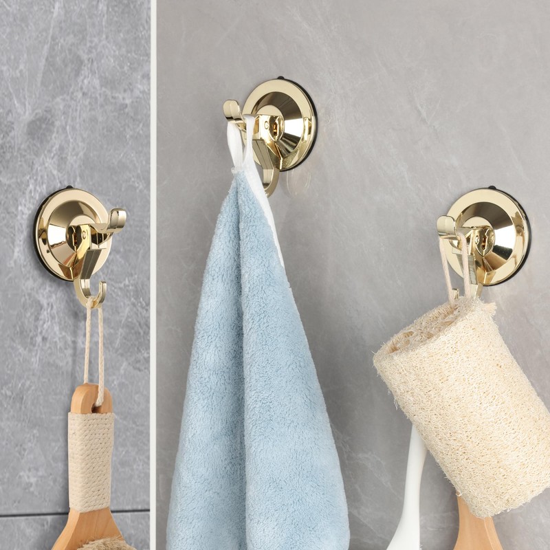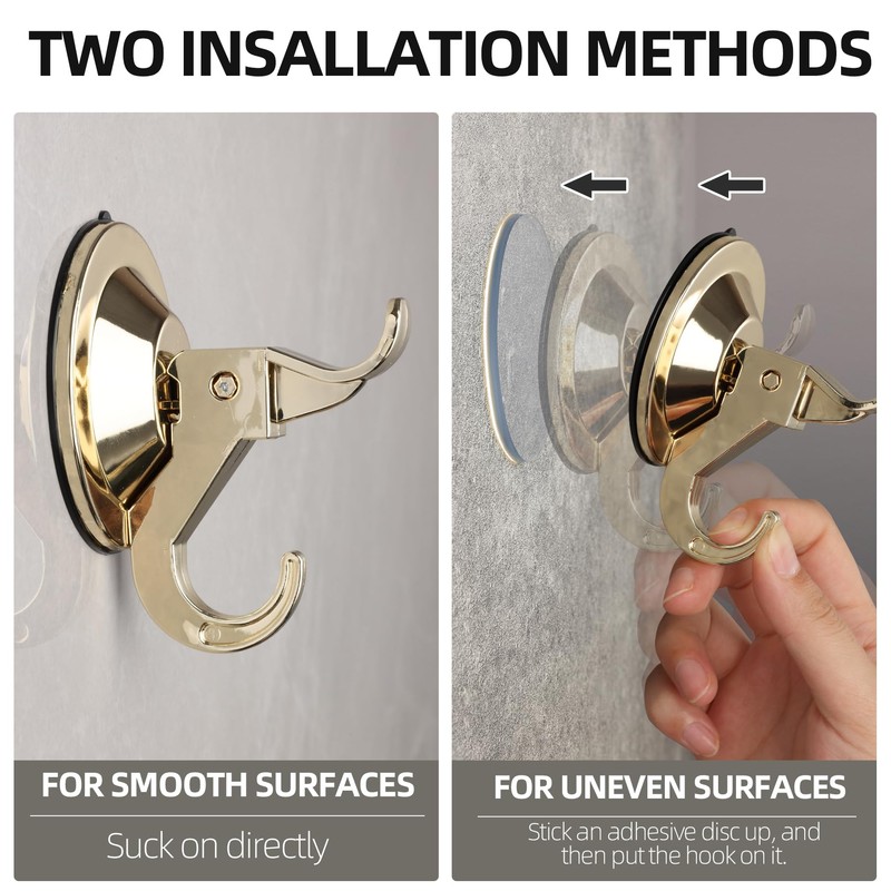 - 【Reusable & Removable】Measuring 3.5 x 2.7 x 1.7 inches, delicate but strong, the gold suction cup hooks can add great aesthetics to your home decor. The hooks are designed to be removable and reusable for your replacement. Simply release the suction cup without any trace. Reuse them for better arrangement.