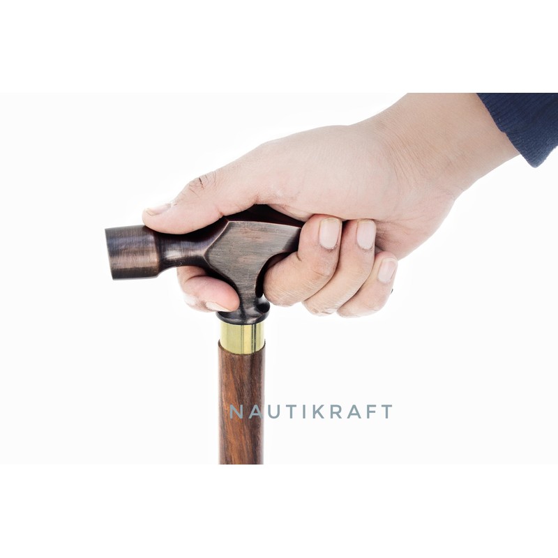 Antique Wooden Walking Cane Stick with Unique Brass Hammer Head Handle, Versatile Rugged Style Support