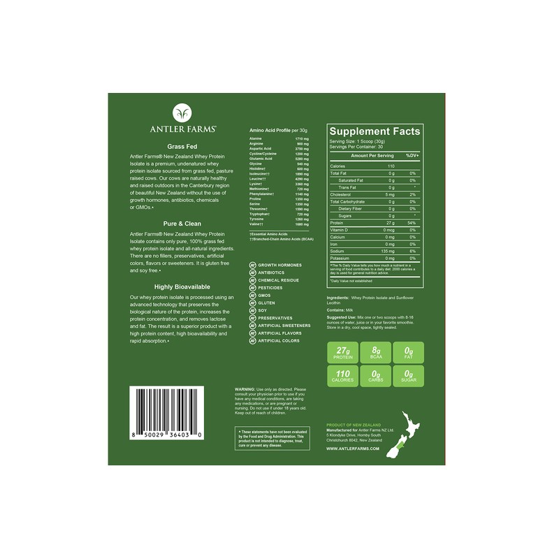 - Antler Farms - 100% Grass Fed New Zealand Whey Protein Isolate, 2 lbs - Pure and Clean, Delicious, Cold Processed