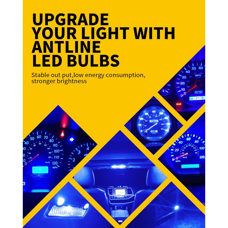 - 300% BRIGHTER: Antline T5 74 and 194 T10 LED bulbs equipped with 3pieces blue high illumination 3030 SMD LED and 9pieces blue high illumination 4014 SMD LED. 360° lighting angle, no dark spots, huge brightness. Bring your car a pure white super bright light output.