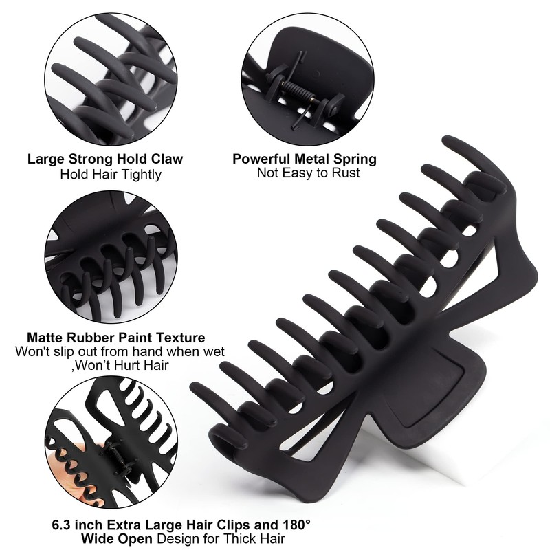 - ★Jumbo Claw Clips for Thick Hair★: 4 pack 6.4x2x2.8''. The xl claw clips is long enough to fit for any hair types like thick, curly, straight, wavy, long or fine hair. Extra large hair clips claw teeth design aims to hold hair in place, strong grip, lightweight to wear all day without making headache. Huge claw clip for thick hair long hair women.