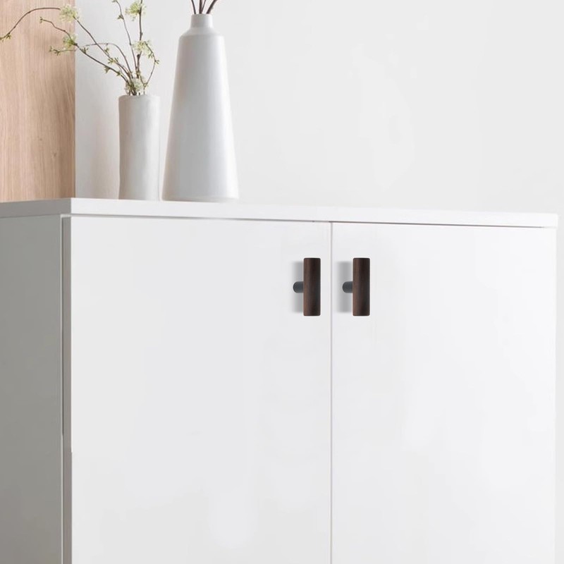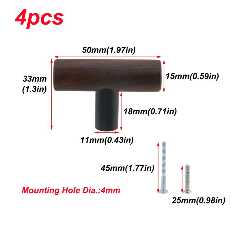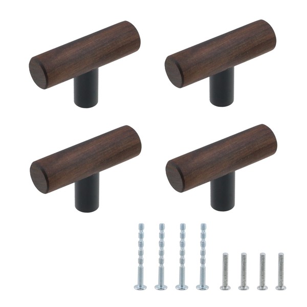 Antrader 4-Pack Walnut Wood Drawer Pulls, Single Hole T Kitchen/Wardrobe/Cabinet Door Pull Handle with Mounting Screws, 1.97" Total Length