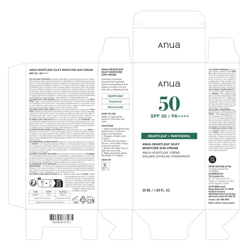 ANUA ANUA Heartleaf Silky Moisturizing Sunscreen SPF 50 PA++++, Korean Facial Sunscreen, Makeup Base, with Niacinamide, Fragrance-Free, Minimal Whitening, 50 ml