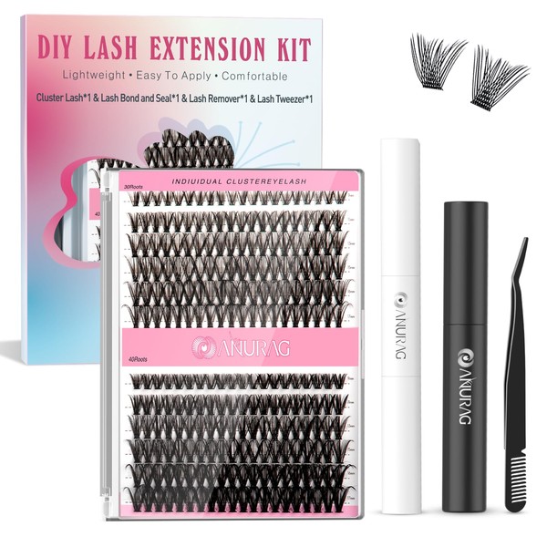 ANURAG DIY Lash Extension Kit 30D+40D Eyelash Extension Kit 240 Pcs Lash Clusters 9-17mm Cluster Individual Lashes Eyelash Extension Kit Thin Band Cluster Lashes Lash Bond and Seal and Lash Tweezers