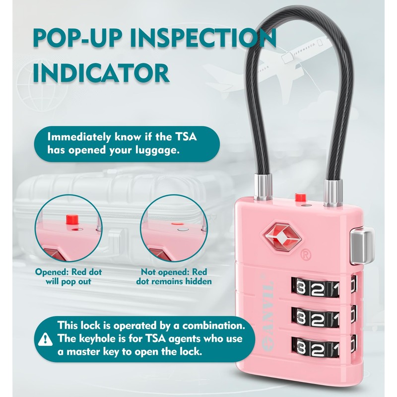 ANVIL Luggage Locks, TSA Locks for Luggage, Advanced TSA008 core, Alert Indicator. A Great Suitcase Lock, Backpack Lock, Gym Lock, Travel Lock for Travel and Daily use. (3, Pink)