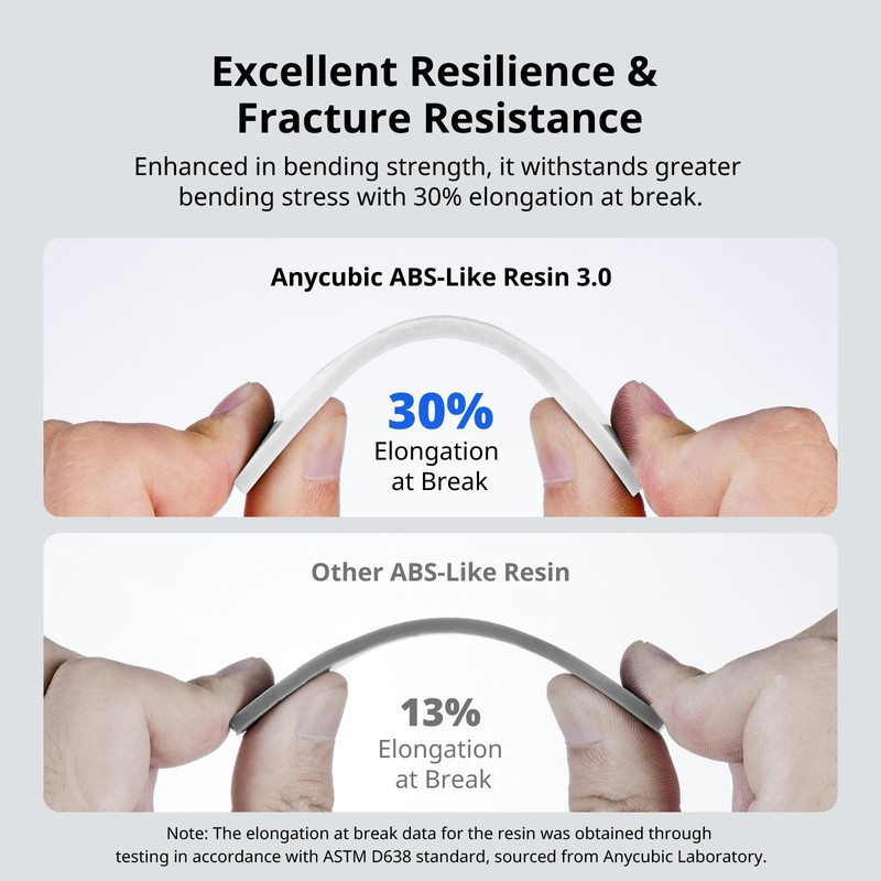 - 【Excellent Resilience & Fracture Resistance】 Enhanced in bending strength, Anycubic ABS-Like Resin 3.0 withstands greater bending stress with 30% elongation at break.
