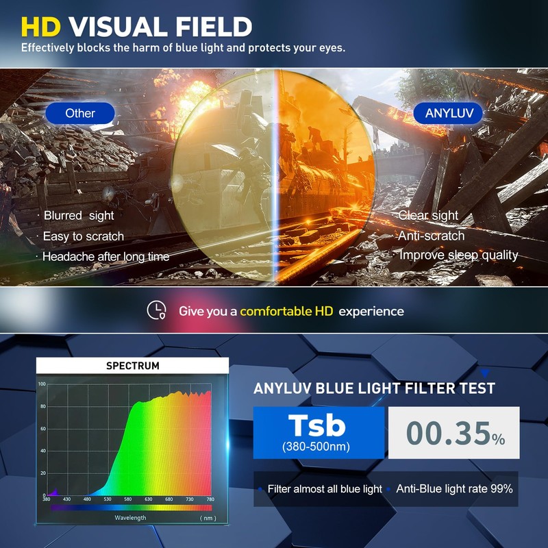 - UV400 Blue Light Protection: ANYLUV blue light glasses are specifically designed for women and men, featuring a 99% blue light blocking capability. These glasses efficiently filter harmful high-energy blue light emitted by screens, ensuring that your eyes remain comfortable without sacrificing your exposure to beneficial blue light.