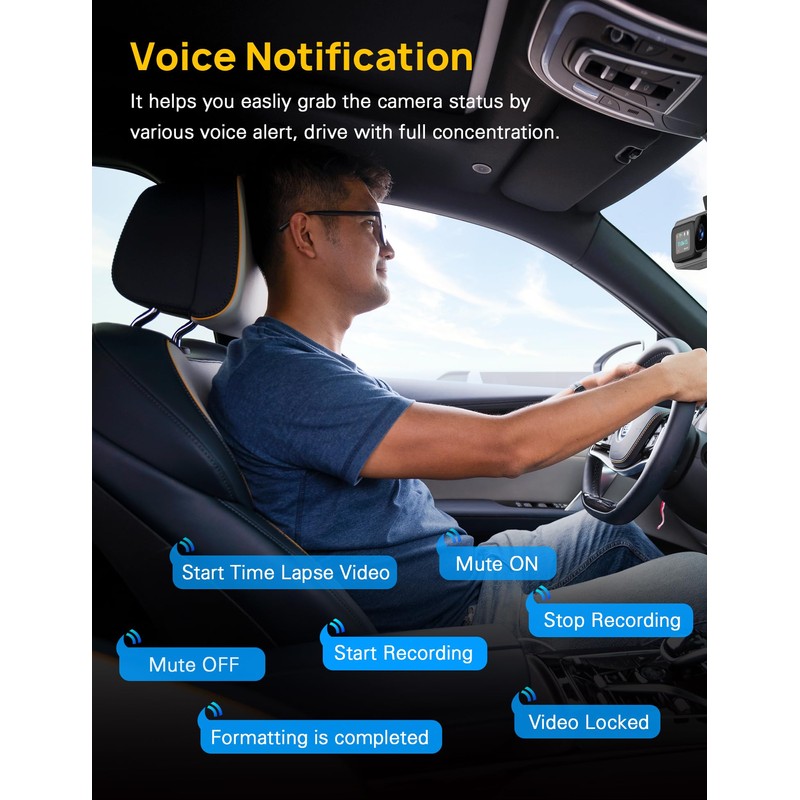 - 【Low Profile Design and Voice Notification】 Thanks to the Low Profile & Hidden Design of the M5 dash camera for cars, you can still get good driving vision, and it will not cause big changes to your vehicle's interior. The unique voice notification also lets you easily grasp the working status of the M5 dash camera for cars, won't disturb you while driving. For the privacy needs, you can also disable the inside camera from the app.