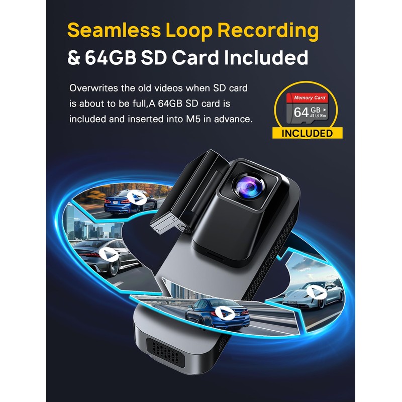 - 【64GB Card Included/Extra Port in Car Charger】 Allows you to plug and play as a free 64GB card is included: You don’t need to purchase an extra card for M5 separately. The lighter port charger of M5 contains a USB port, which can allow you to charge your cellphone or other electric device on the way and this will not take away the charging source in your car while the camera is recording.