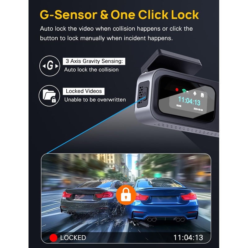 - 【Loop Recording & Gravity Shock Sensing】 Loop Recording- Less memory maintenance is required from you: when the memory card is about to be full, the loop option will auto-overwrite the oldest video. Gravity Sensor- Extra Witness when the incident happens: Built-in 3-axis gravity sensor will auto-lock the videos and make them unable to delete when it detects a serious collision occurs, extra insurance for incident/event.