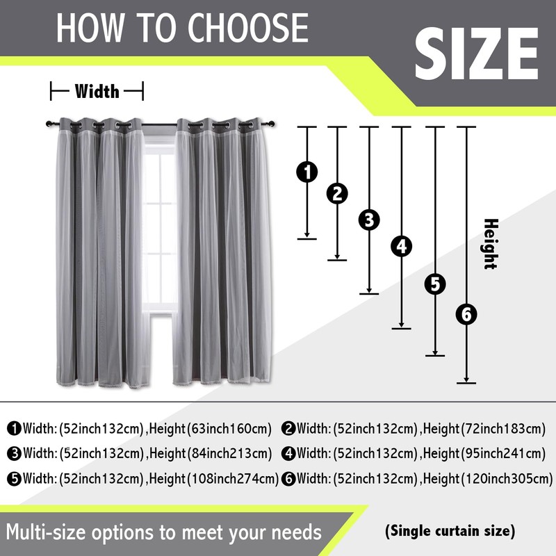 - 【BASE INFORMATION】Grommets top(1.6 inch inner diameter), Curtain measures 52" wide per panel. Available length include 63", 72",84", 95",108",120",2 detachable ties per package.