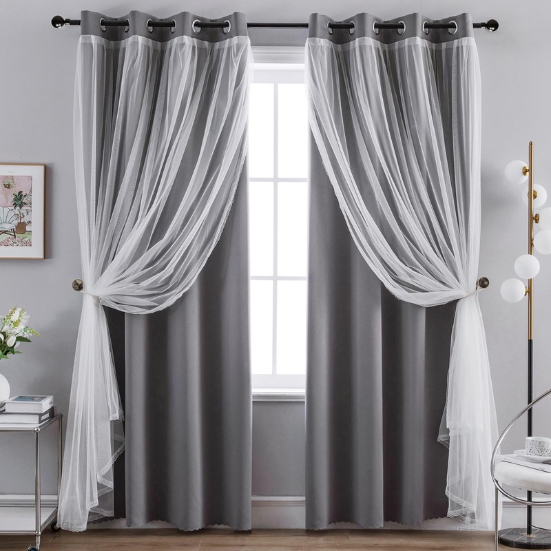 Anytime Home Curtains Blackout and Sheer Layered Solid Window Curtain Panel Pair with Grommet Top, 52Wx72L,Grey