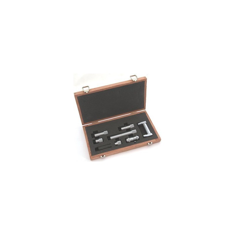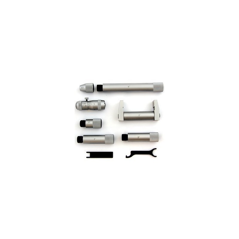 * Each set consists of an inside micrometer head and a series of fully hardened and lapped extension rods of different lengths. * Anvil and spindle are hardened and precision ground with microlap finish on ends. * Spindle thread hardened, ground & lapped. * Microfine graduations on satin chrome. * Positive locking nut on spindle. be calibrated by a micrometer or ring gage. * Coiled spring pressure contact type rods are each marked with appropriate length. * Quick, easy zero adjustment on the sleeve. * Meets or exceeds Federal accuracy specs. * Reference standard included with set. * Includes a wrench and a fitted case. * Range: 2" to 12" * Graduation: 0.001"