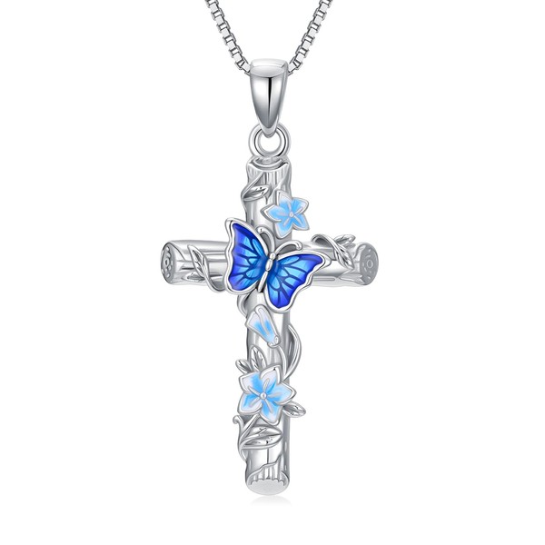 AOBOCO Cross Butterfly Necklace 925 Sterling Silver Wooden Shaped Cross Christian Faith Religious Jewelry Gift for Women, Sterling Silver, No Gemstone
