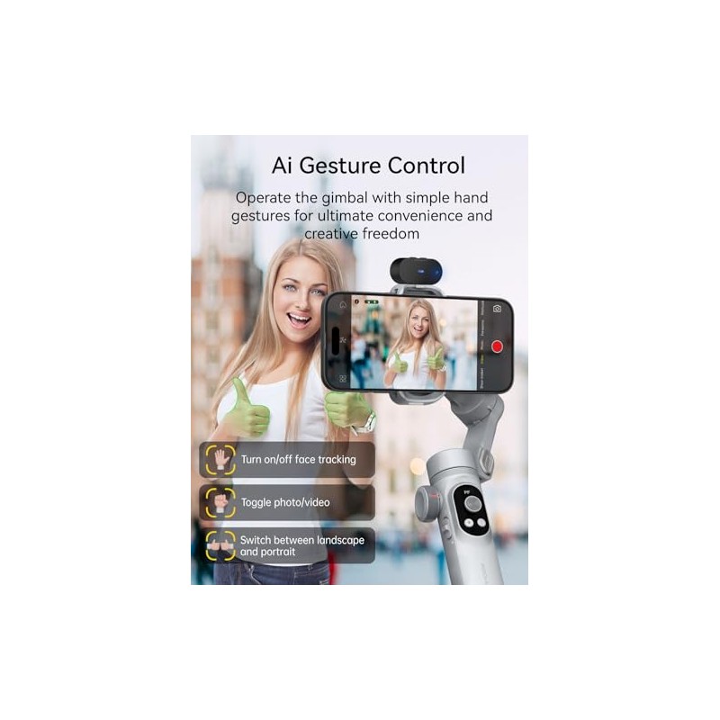 - AI Face Tracking Sensor: Our advanced AI sensor is specifically engineered for precise face tracking, using sophisticated algorithms to detect and follow human faces within the frame. This technology significantly improves the gimbal's capability to keep the subject's face in focus and well-composed during movement, ensuring smooth and professional-looking video content. With the built-in AI module, you can effortlessly capture high-quality videos without the need for additional software. Experience a new dimension of freedom and creativity with our AI-powered gesture control system