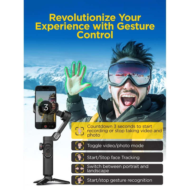 - Smart Tracking 6.0: Our gimbal has a built-in tracking system that can accurately recognize and track. Face tracking, body tracking, object tracking and third-party live tracking four modes to meet your different shooting needs. Just click on the target object on the screen, the gimbal will automatically track and shoot, allowing you to take more creative photos. Moreover, the gimbal with gesture control function, capture your most creative shots effortlessly with intuitive gesture controls. Simply gesture accordingly, and our Phone gimbal will respond, ensuring you stay the center of attention