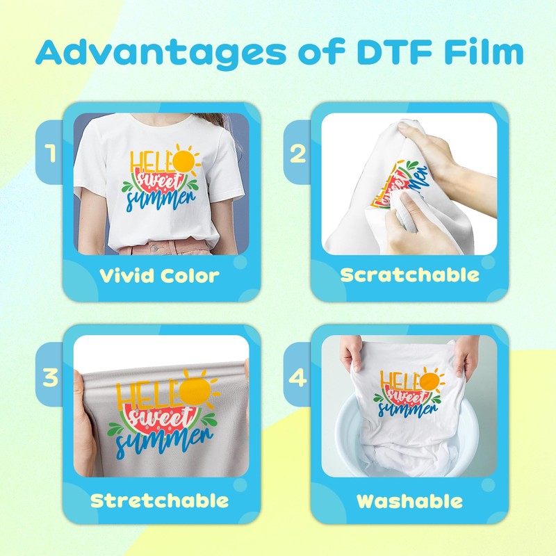- Ideal for printing on textiles, T-shirts, and all fabrics, this film is washable and crack-resistant, ensuring durability. There are NO color restrictions and NO fabric restrictions. It is perfect for use in the fashion industry and for personalized gifts. PLEASE NOTE: You will need to print the pattern with a DTF printer, DTF ink, and DTF powder.