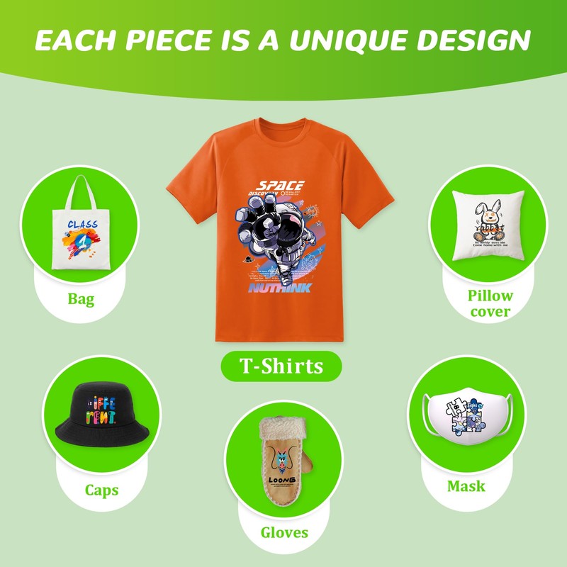 - 【Uniquely DIY Gift】---DTF transfer sheet work for all colors of common fabrics including dark black light white colors, canvas, spandex, nylon, jeans, polyester, etc. Elevate your DIY crafting experience with the DTF transfer. Create unique T-shirts, bags, caps, gloves or masks for your family, lover and friends.
