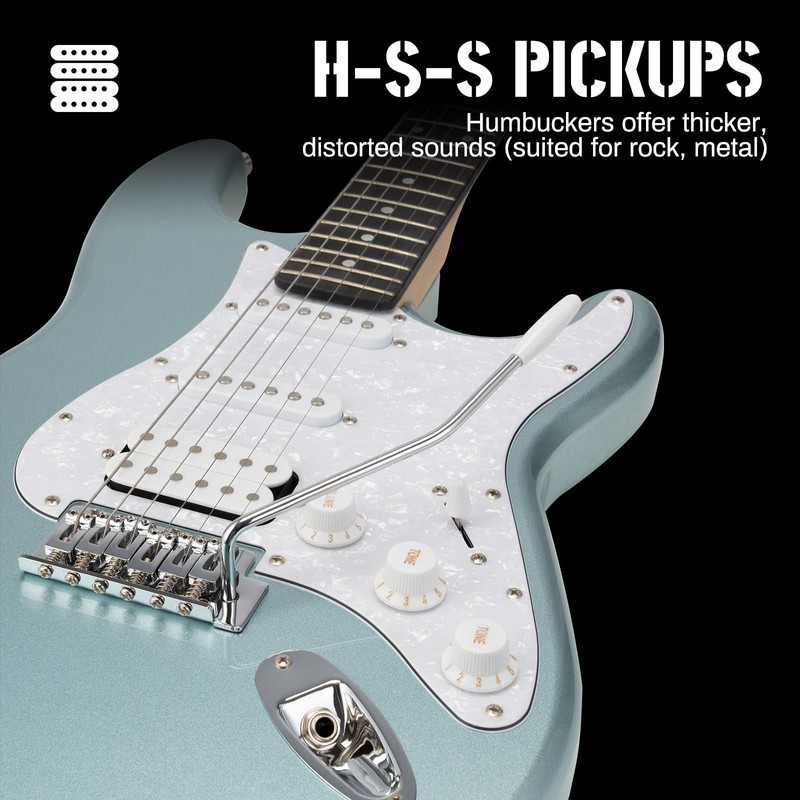 - [HSS pickups]: The beginner electric guitar set has two classic single-coil pickups and one double-coil pickup, which makes the AODSK electric guitar mellow and powerful, with low noise and strong stability. The AODSK electric guitar has 5 pickup switches and 2 tone and volume controls to choose from, suitable for different music styles