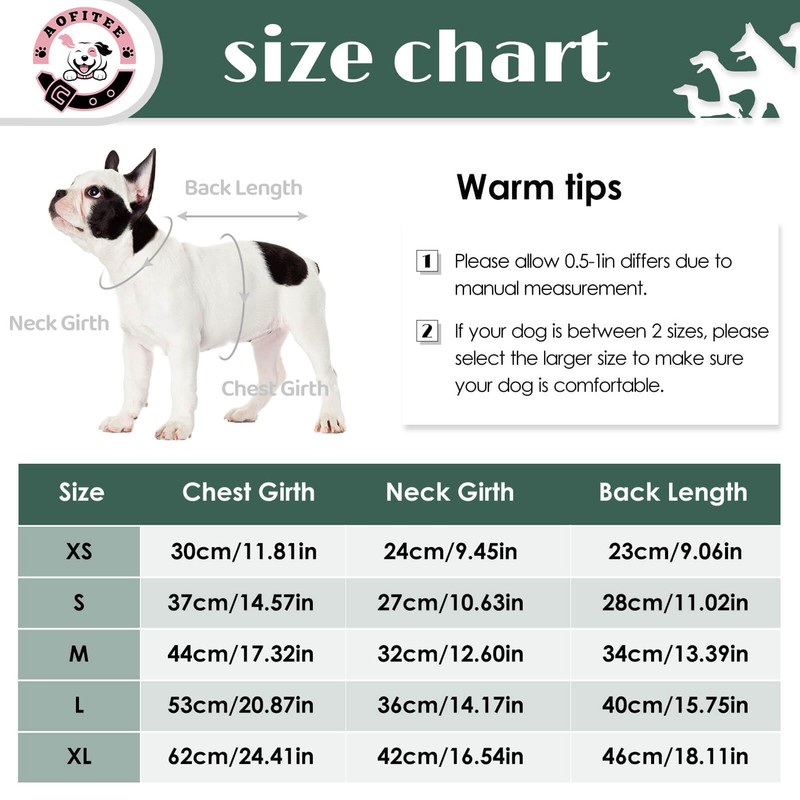 XS-Chest Girth:30cm/11.8inch Neck Girth:24cm/9.45inch Back Length: 23cm/9.06inch
