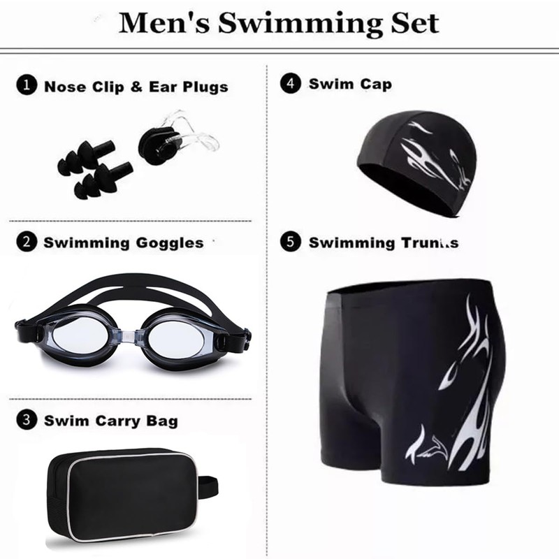 Aokesy Gafas de Natación 5 en 1, Kit de Natación Incluye Gorro de Natación, Gafas Ajustables, Auriculares, Clips para la Nariz y Bañador Corto de Natación Secado Rápido con Bolsa para Hombres, Mujeres
