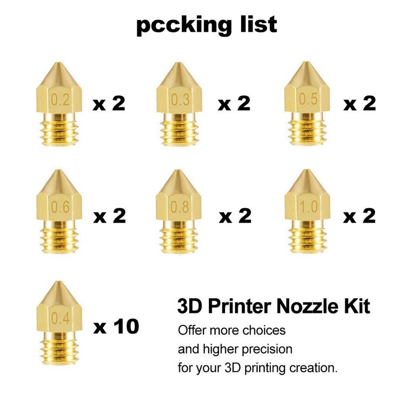 - Package include: 22 Pcs MK8 extruder nozzle, 7 sizes: 2 x 0.2mm, 2 x 0.3mm, 10 x 0.4mm, 2 x 0.5mm, 2 x 0.6mm, 2 x 0.8mm, 2 x 1.0mm.