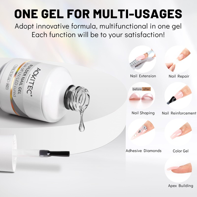 - 🧸 Versatile Gel Builder in Bottle - Aokitec one gel can meet several nail art needs, you can use the hard gel to extend your nails, repair your broken nails, strengthen nails, build apex, shape nails, as color gel polish or adhesive rhinestones/gems/ jewels on your nails. Multifunctional provide you more convenient for your DIY Mani. Each function will be to your satisfaction!