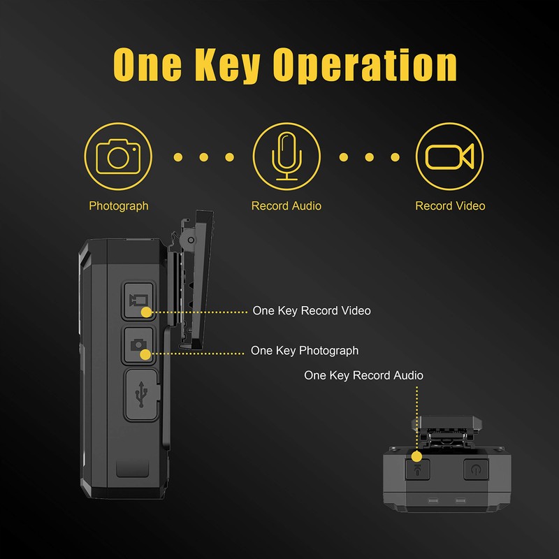 - 【One key operation & Multi Function】- The body camera supports one key to Record Audio, Video and Take Photograh, not need to power on the cam, make the operation simpler in a sudden state. The camera also supports one-key to turn on the flashlight, red dot positioning laser function