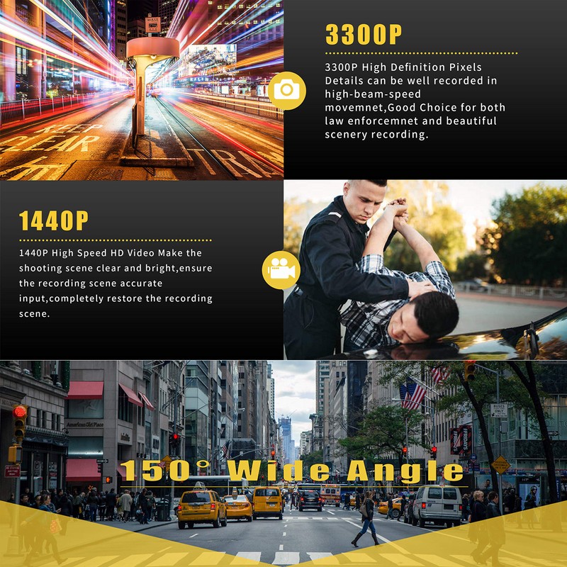 - 【Portable FHD 1440P Body Cam 】- This body video / audio Camera for law enforcement with FHD 1440P video and 3300pixels photo and 150° wide angle allows users to get footage clearly and widely. Perfect for police officers, security guards,police officers, or other personal.Video Capture:Default resolution is 720p, up to 1440p (When set to 720p, the camera lasts the longest time.)