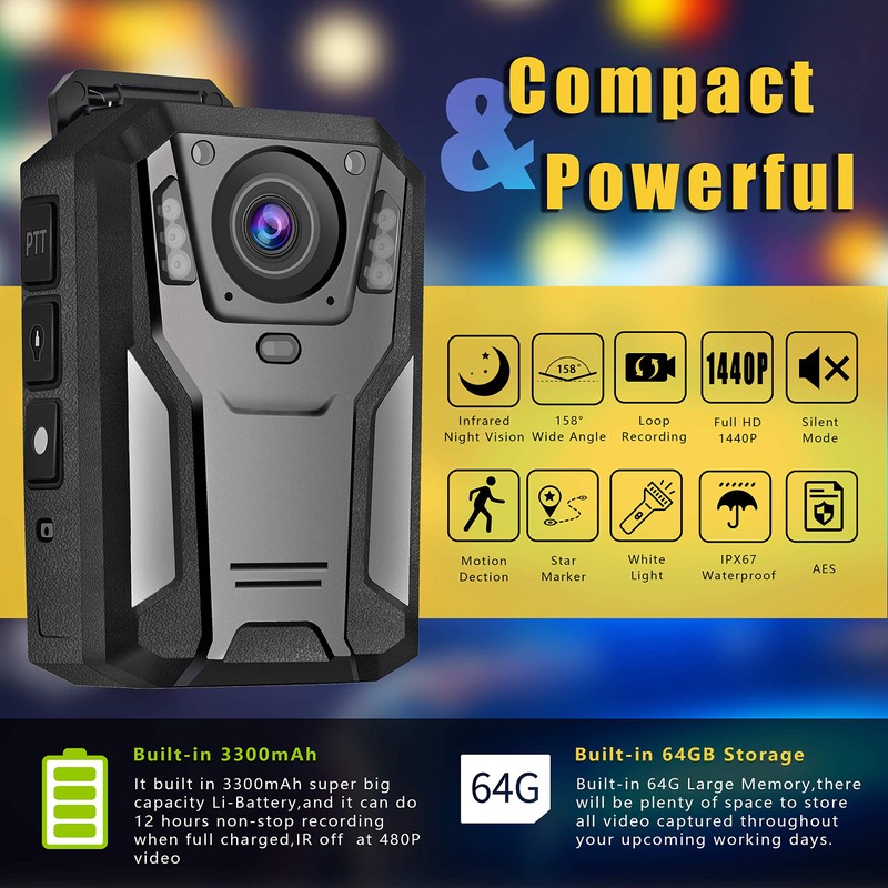 - 【Long Battery Life & 64GB Ultra large Memory】 - With a built-in powerful 3300 mAh battery, the body cam supports 11 hours non-stop recording, enough to get through multiple shifts without worry about battery life. And its built-in 64 GB Memory allows for hours of footage without worrying about running out of space.
