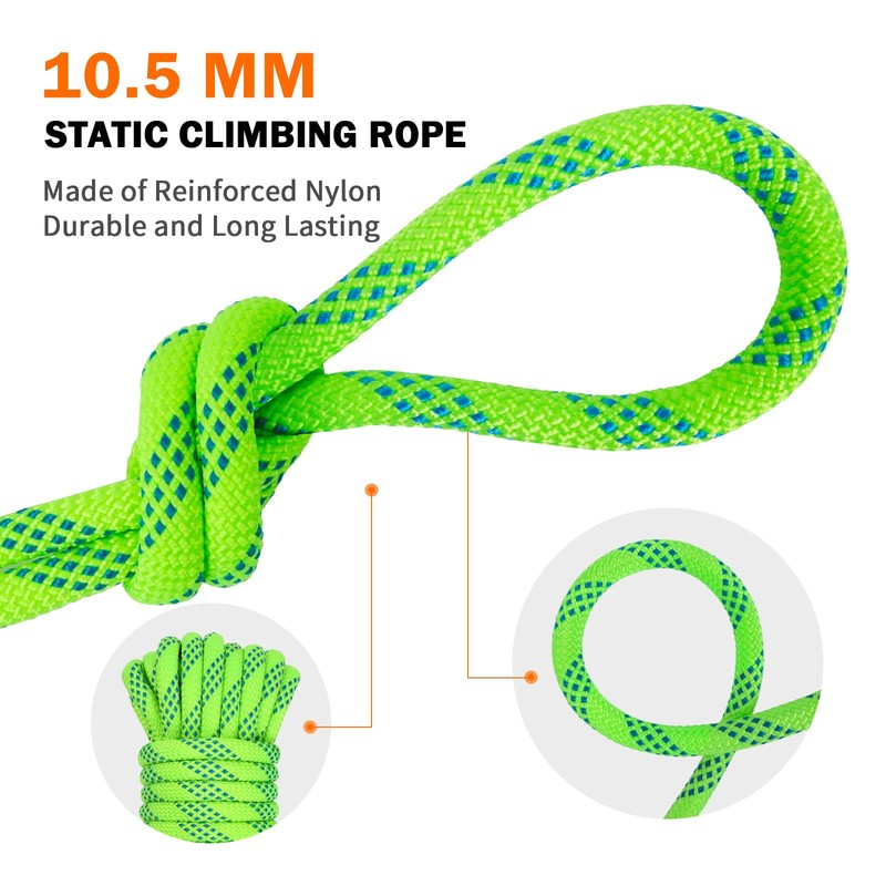 - 10.5mm Static Rope: This 10.5mm climbing rope is enough strong abrasion resistance, moderate soft, strong binding force, anti-slip and tear resistant. Package Content: 1 x Static Rope, 1 x Drawstring Rope Bag