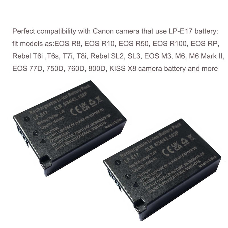 - The Battery compatible with LP-E17 original battery: fit replacm for Canon EOS R8/ EOS R10/ EOS R50/ EOS R100/ EOS RP/ Rebel T6i /T6s/ T7i/ T8i/ Rebel SL2/ SL3/ EOS M3/ M6/ M6 Mark II/ EOS 77D/ 750D/760D / 800D/ KISS X8 camera battery and more.