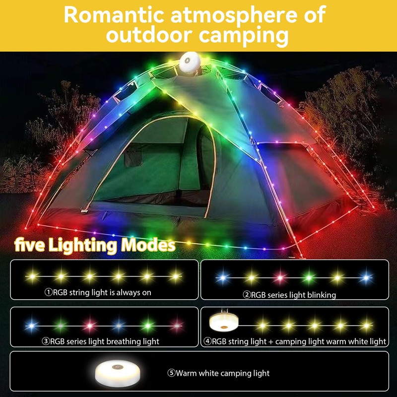 - ??7 Lighting ModesCustomize your outdoor ambiance with 7 different lighting modes. Including colorful and colorful alternating flashing, breathing, and strong light options. This camping light offers versatile illumination choices for different scenarios. Easily switch between modes to suit your needs with just a press of a button. Whether you prefer a steady glow, gentle twinkle, or dynamic flashing effect, lighting string offers versatile options to suit any mood or occasion.