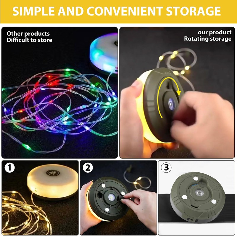 - ??Versatile 2-in-1 Camping Light StringThis is an integrated camping light that cleverly combines the characteristics of camping lights and atmosphere lights, and solves the problem of recycling lamp belt through a manual device. This multifunctional camping string light serves not only as essential camping lighting but also as emergency lighting, flashlights, and even distress signal lights.Perfect for home and tent decoration, birthday celebrations, and holiday festivities.