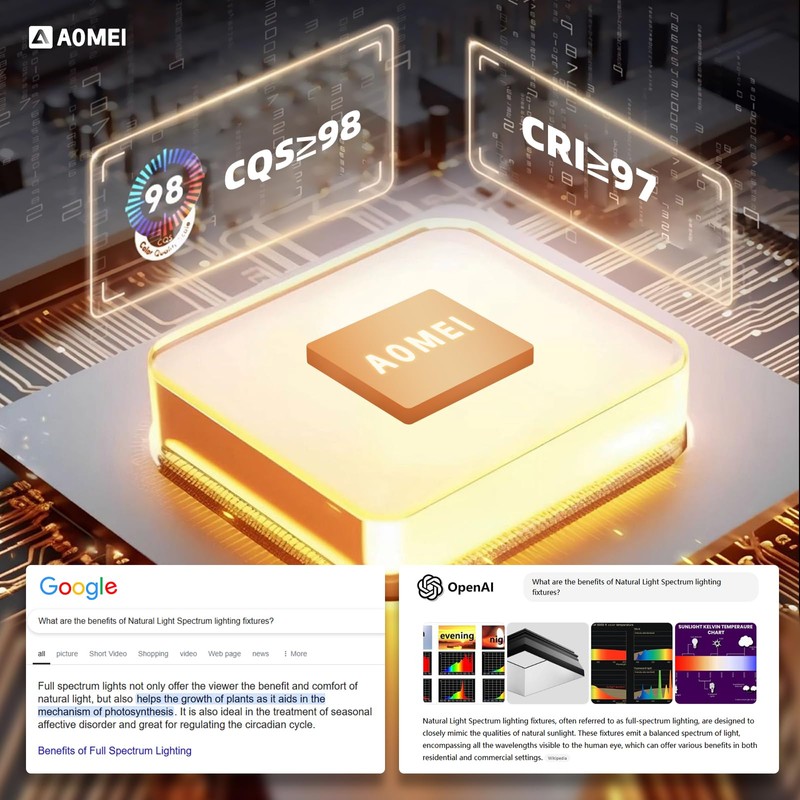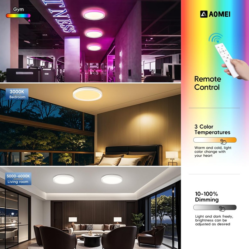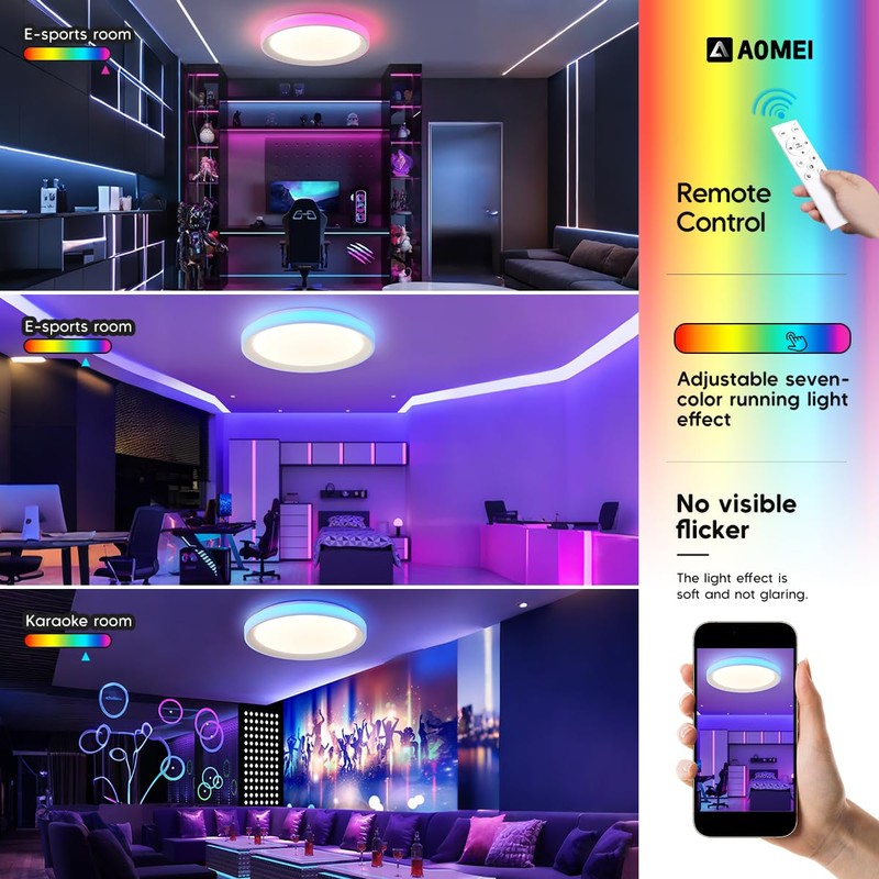 AOMEI 16 Inch Natural Light Spectrum Ceiling Light - 40W RGB Color Changing LED Panel with IR Remote Control for Bedroom, Gaming Room & Gym