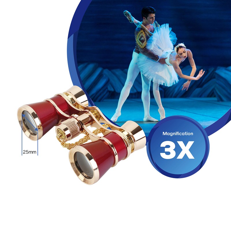 - The theatre glasses have optical lenses with 3x magnification, 25mm lens width lens balances the magnification and field of view, design for indoor viewing.
