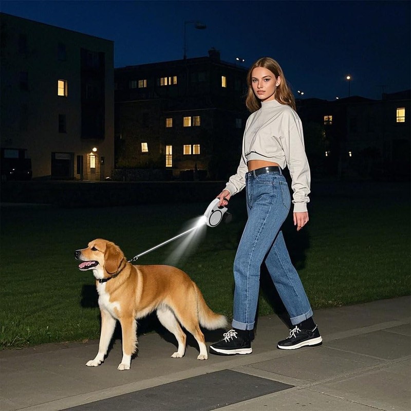- Easy to use: the handle is ergonomically shaped and sits comfortably in the hand, so it does not fatigue even during long walks. The portable waste bag holder has been thoughtfully added so you can easily dispose of your dog's poop. It is equipped with an LED light on the side, which makes travelling at night more convenient. Please avoid your dog chewing on the lead for a long time or rubbing it on the ground as this will shorten its service life.