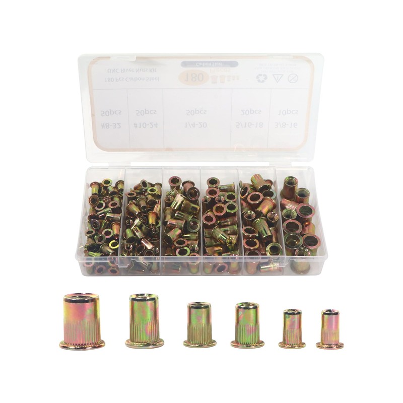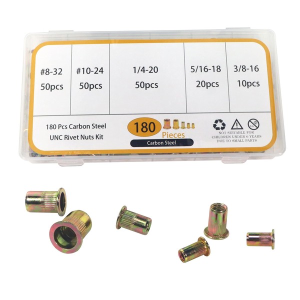 AOMIKITSTU Rivet Nuts 180pcs, 8-32, 10-24, 1/4-20, 5/16-18, 3/8-16in Threaded Rivet, Flat Head Threaded Insert Nutserts Assort, Insert Nutsert Rivnuts Kit for Tunnel Coal Mines