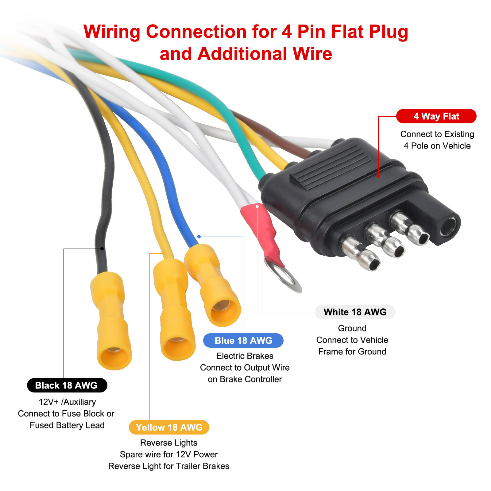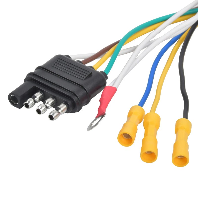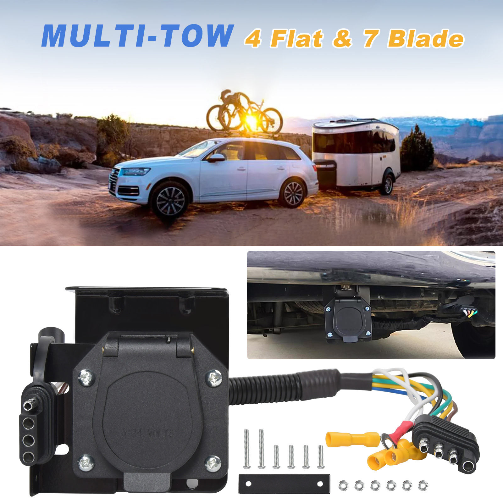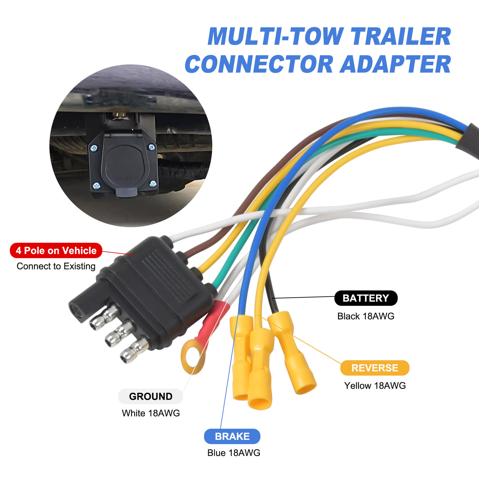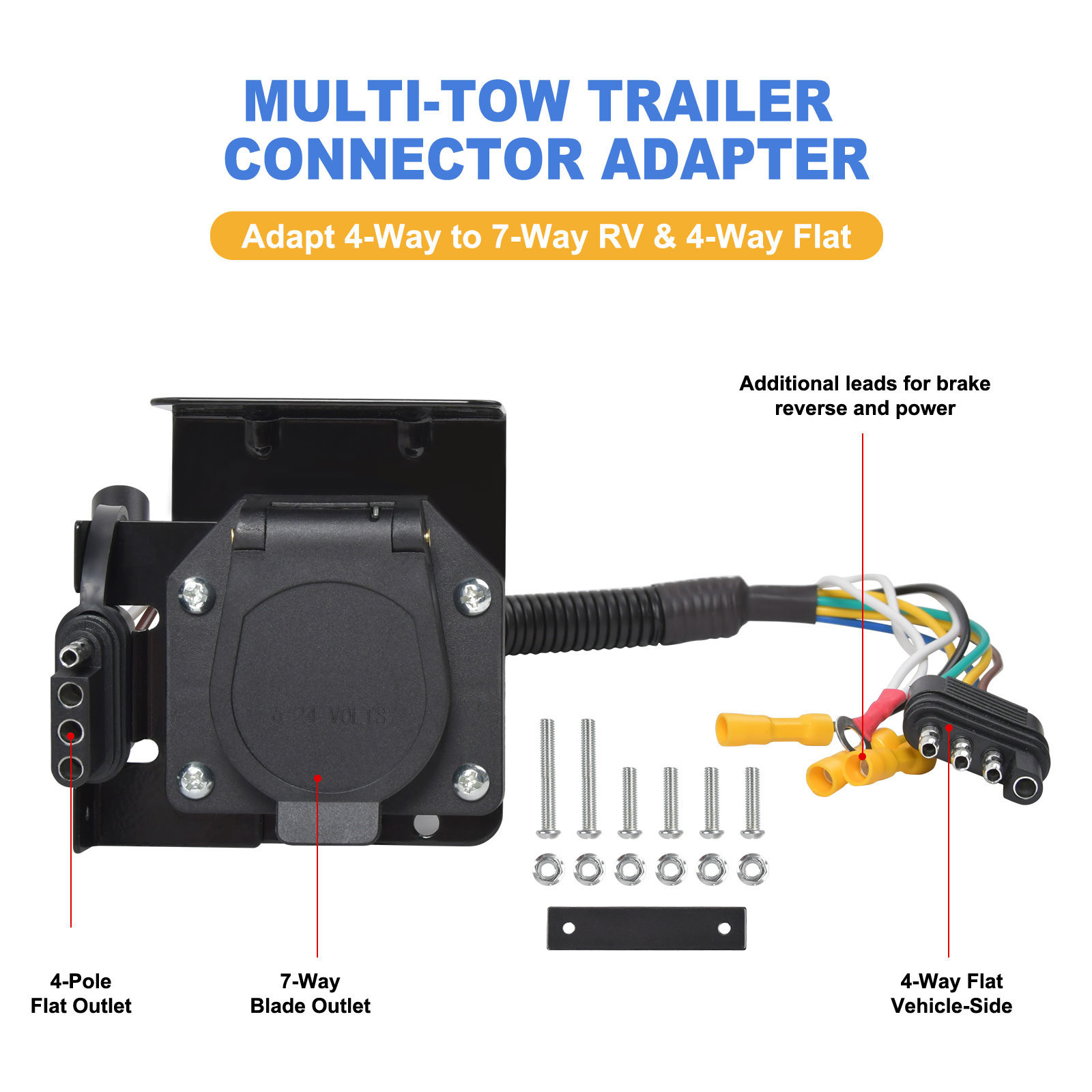 - Multi-Plug: Dual-output 4 pin to 4 and 7 pin trailer wiring adapter provides multiple tow options from one vehicle-end connector for towing different trailers; Additional leads for brake, reverse and power function, converts vehicle side 4-pin factory socket to a combination 7-pin rv and 4-wire flat.
