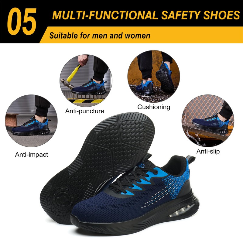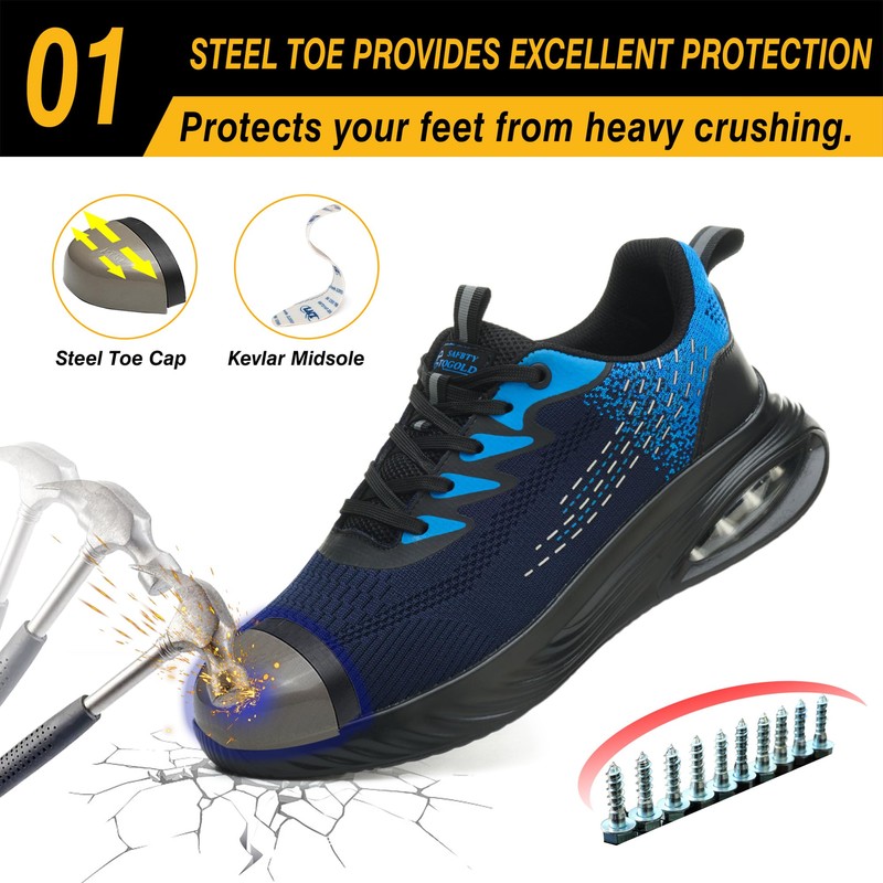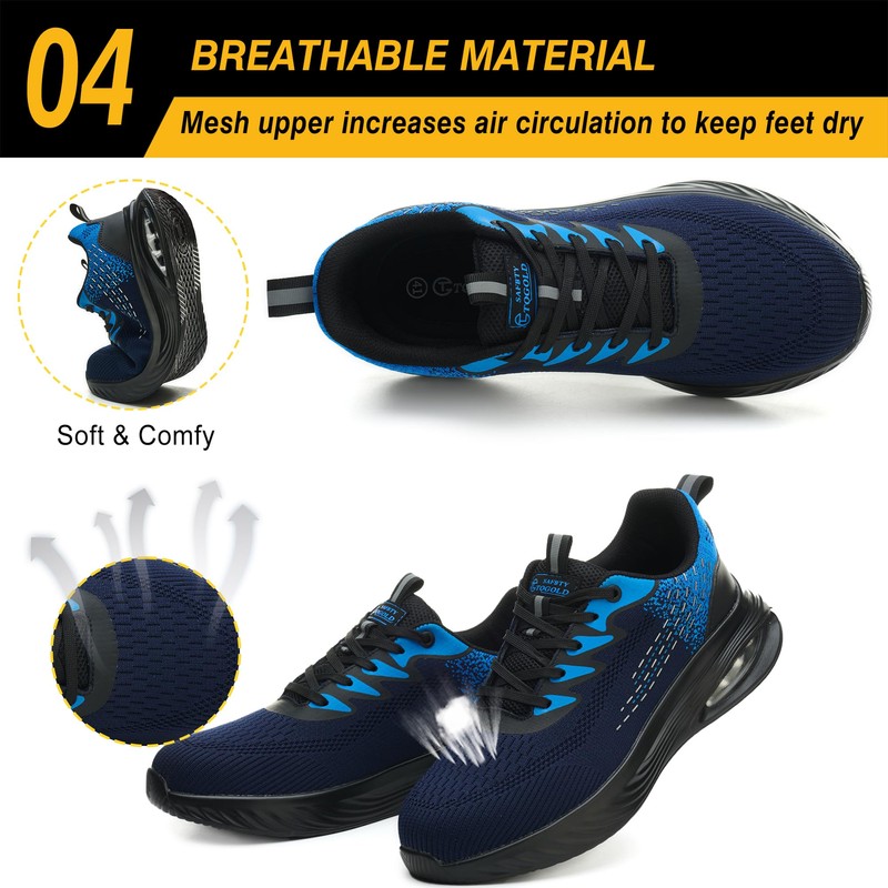 - Shock Absorption & Cushioning: The steel toe sneaker weighs about 500g which is lightweight. The insole provides good support for the feet and the air cushion outsole has good cushioning, so you won't get tired even if you work for hours.