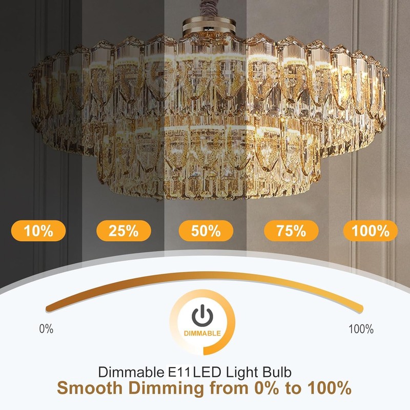 - 【Dimmable】 E11 led bulb dimmable, seamless dimming capability (0% - 100%) suitable for high or low settings with no flicker or noise. The dimming system isn't compatible with few old microwave systems.