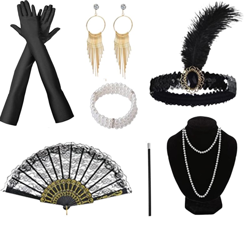 - Complete 1920s Set: Get everything you need for your 1920s look with this 7-piece set, including a feather hairband, faux pearl necklace, long holder, gloves, and earrings.