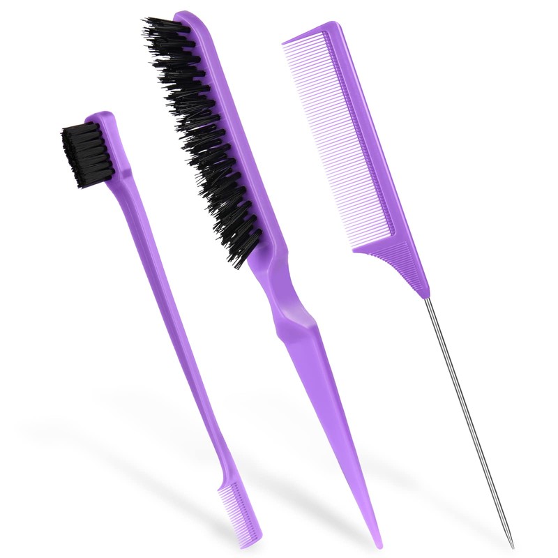 AOOWU 3 Pcs Slick Brush Set, Volume Creating Teasing Brush Set, Hair Styling Comb Set Include Bristle Hair Brush Double Sided Edge Brush Rat Tail Comb for Women Kids Edge Back Hair Smoothing (Purple)