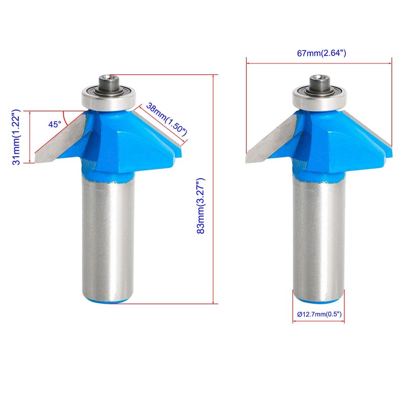 Aopin 45 Degree Chamfer Edge Molding Router Bit 1/2" Shank Upper Bearing Beveled Edge Shape Router Bit Cutter Woodworking Tool Blue Silver 1 Piece